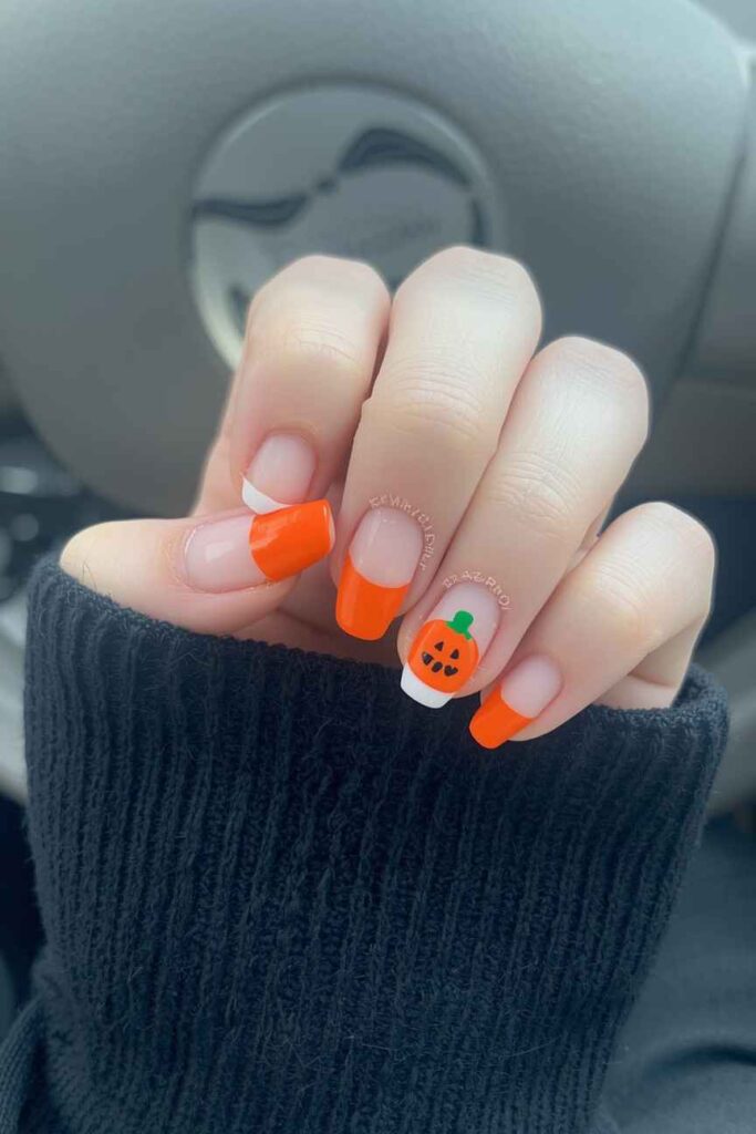 Paint one nail with a small orange tip or half-moon shape. Pair with nude nails for minimal, festive style. This subtle pop of color nods to Halloween without being busy.