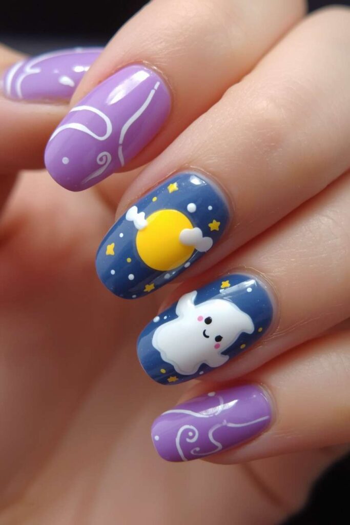Combine a tiny ghost and crescent moon on accent nails over a soft base. The minimal design evokes Halloween without heavy colors or dramatic patterns. Use delicate lines for a chic finish. This manicure is playful, stylish, and perfect for those who prefer subtle, elegant, and festive nail art.
