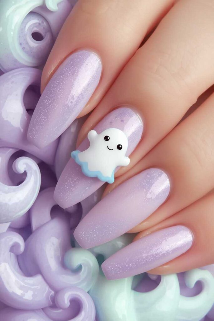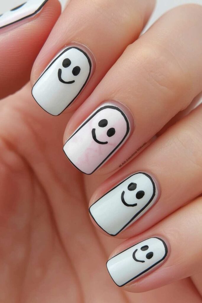 Paint small, simple ghosts on one or two nails while keeping the others neutral. This subtle design adds Halloween charm without overpowering your manicure. Use a nude or pastel base and add tiny black dots for eyes. The minimalist ghost design is playful, chic, and perfect for those who want seasonal nails that are subtle, elegant, and easy to recreate at home.