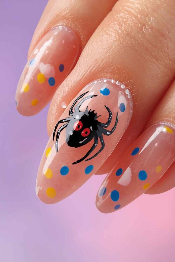 Paint a tiny spider on one nail using minimal lines. Pair with nude or pastel nails for an understated Halloween design. Subtle, cute, and playful, this manicure brings Halloween vibes without being overwhelming.