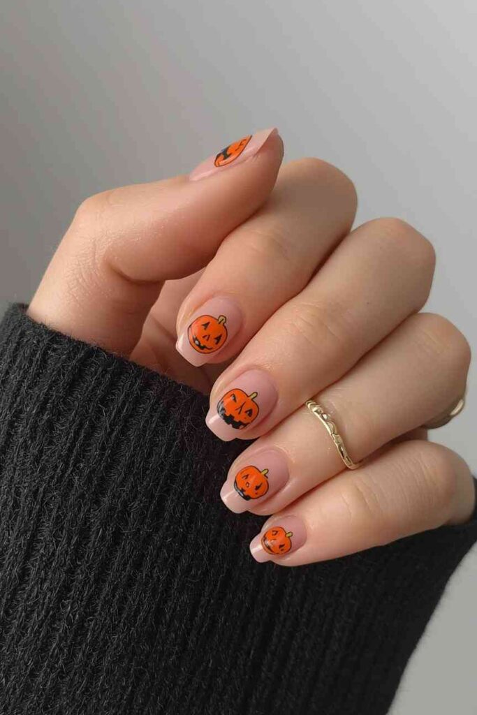 Add small smiling pumpkin faces to one or two accent nails. Keep the rest neutral for balance. Minimal yet festive, this design is perfect for subtle Halloween fun while staying stylish and wearable.