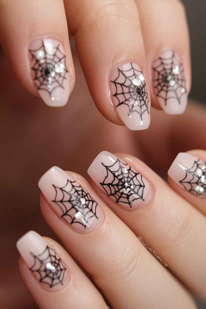 Draw a delicate white spider web on one accent nail with a nude or pastel background. Minimal yet recognizable, the design brings Halloween vibes without looking busy. Add a small rhinestone at the web’s center for a chic touch. This simple manicure balances seasonal theme and elegance, making it wearable and stylish.
