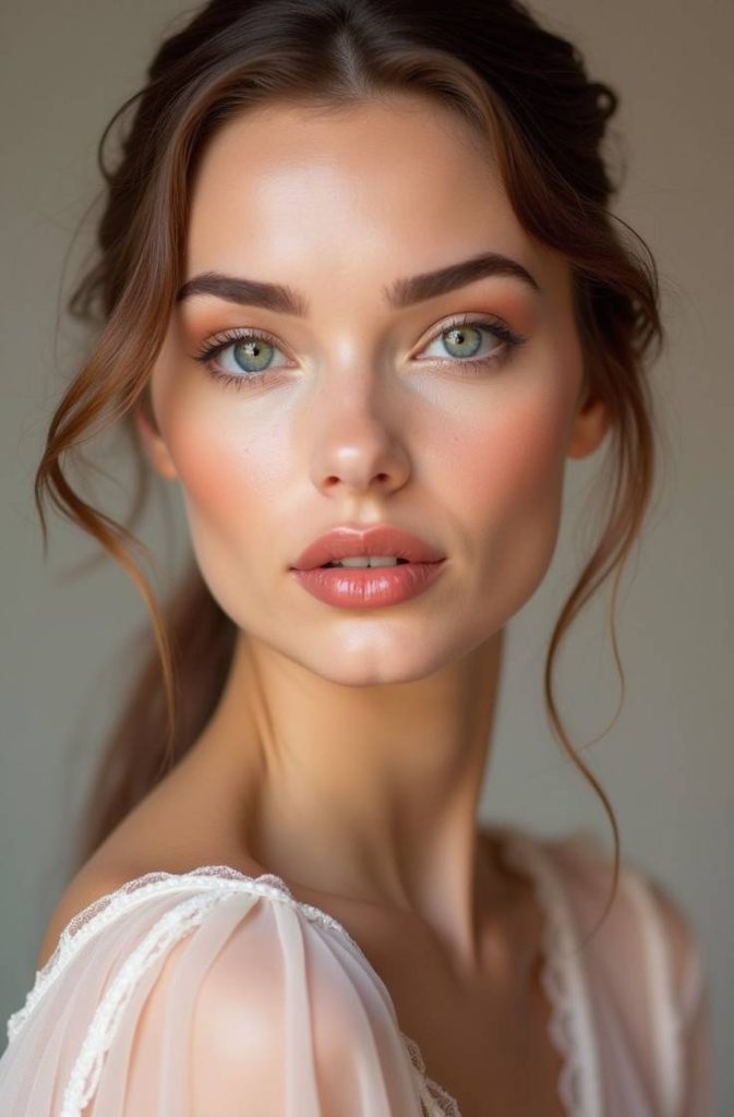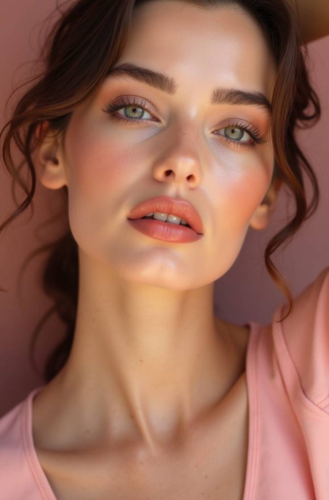 A peachy makeup look offers warmth and softness, making it a flattering choice for Valentine’s Day. Peach tones brighten the complexion and create a healthy, natural glow. This look typically features peach blush, subtle eyeshadow, and nude-peach lips for a cohesive finish.