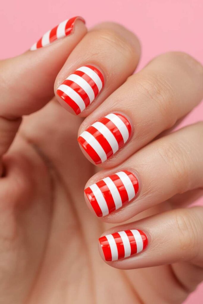 Candy cane stripes are as classic as Christmas cookies and hot cocoa. This nail design combines crisp red lines with white stripes to perfectly mimic the iconic peppermint swirl. It’s playful, cheerful, and instantly recognizable.