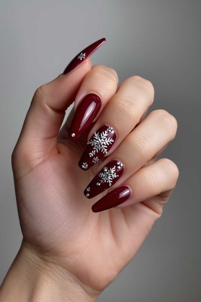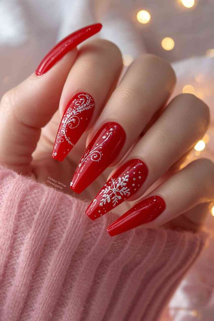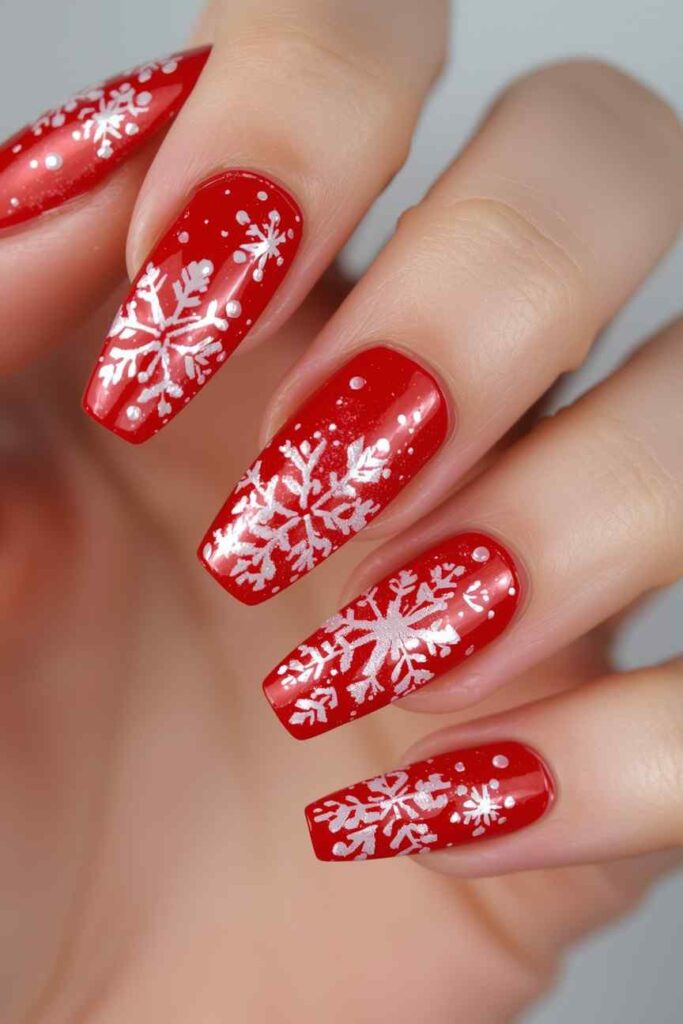 Snowflake designs can be as simple or detailed as you want, ranging from soft minimalist flakes to intricate, lace-like patterns. No matter the style, snowflakes layered over red always create a crisp, refreshing winter look that never goes out of style.