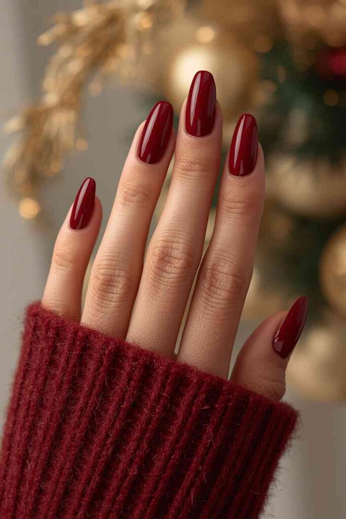 Deep wine red Christmas nails bring elegance, sophistication, and a rich winter charm that feels timeless. This darker shade of red is perfect for those who prefer a more refined, sultry take on holiday beauty. It pairs beautifully with winter fashion—think wool coats, leather boots, and glamorous evening dresses.