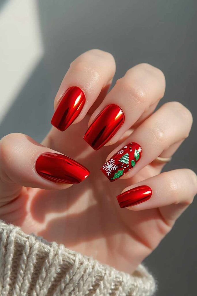 Red chrome nails offer a shimmering metallic finish that perfectly balances boldness and holiday glamour. The reflective surface gives a futuristic touch while still embodying festive warmth. This design suits anyone who loves standout nails that demand attention.