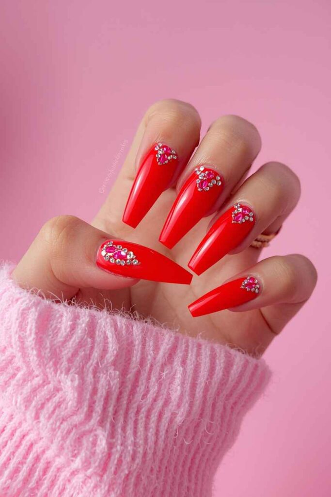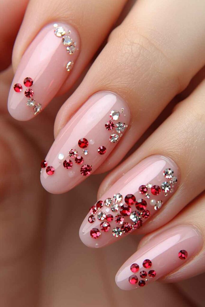 Red rhinestone accent nails deliver instant glamour with a festive twist. The vivid red base already exudes holiday energy, but adding rhinestones brings the perfect touch of sparkle that shines beautifully under Christmas lights. This design is ideal for holiday parties, winter gatherings, and any moment when you want your nails to stand out with elegance.