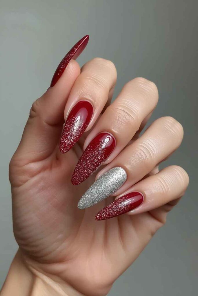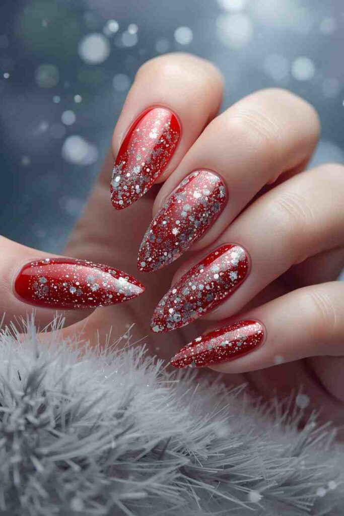 Red and silver glitter gradient nails embody holiday sparkle in the most sophisticated way. The design transitions from a deep red base into shimmering silver tips, resembling falling snow or the glimmer of twinkling Christmas lights. This gradient effect adds dimension and movement, making your nails appear brighter and more dynamic.