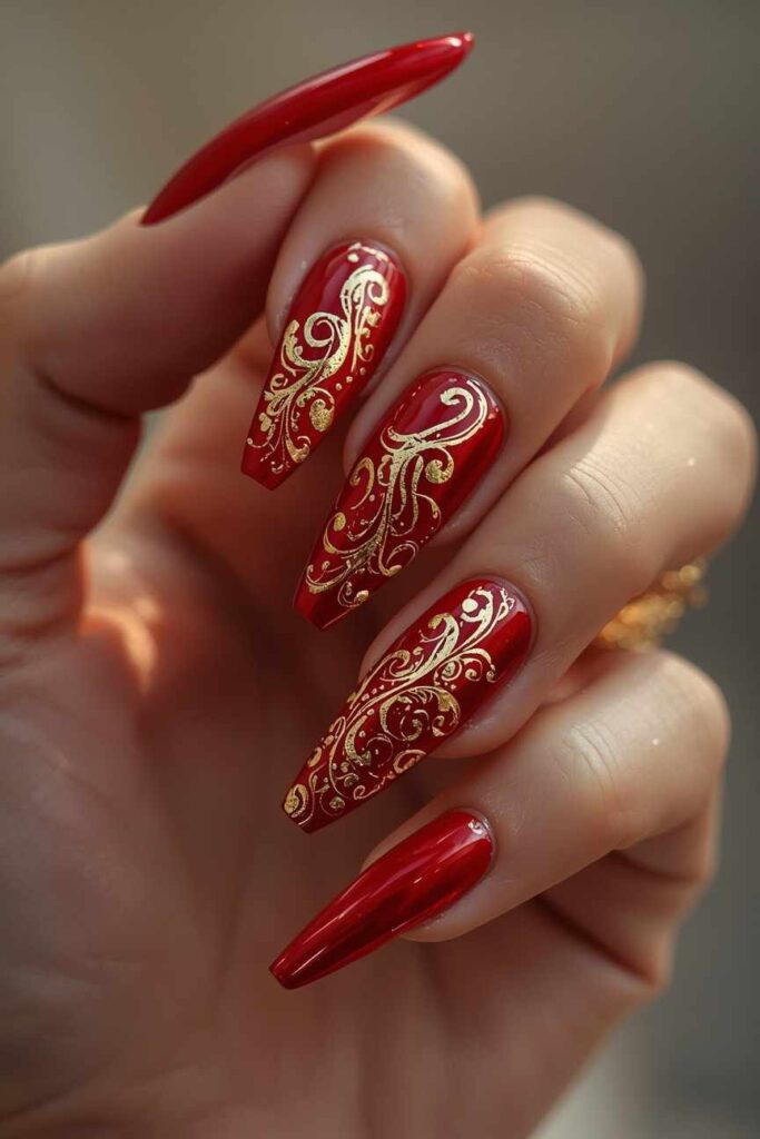 Nothing says festive luxury like red nails with gold foil accents. The metallic foil adds dimension and shimmer, creating an expensive-looking manicure without overwhelming the red base.