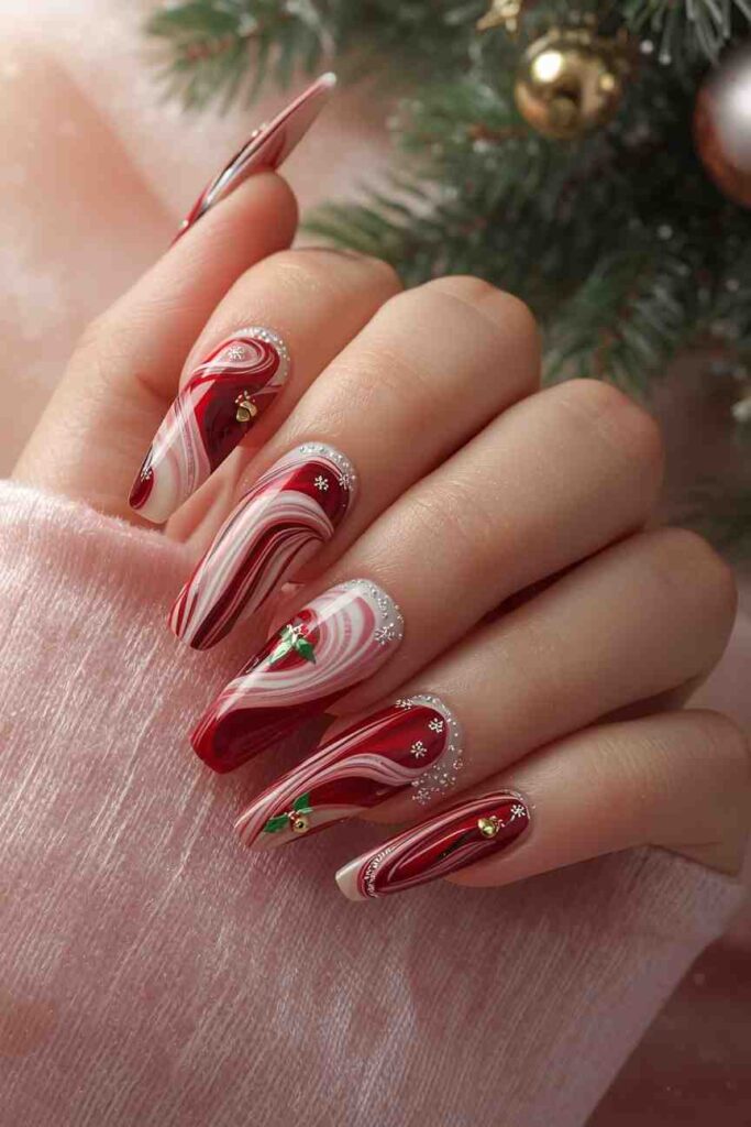 Red marble Christmas nails combine festive color with sophisticated artistry. The swirling marble pattern blends shades of red, white, and sometimes gold or silver to create a luxurious stone-like effect that feels both elegant and timeless. Each nail becomes a mini piece of art, offering depth, richness, and holiday charm.