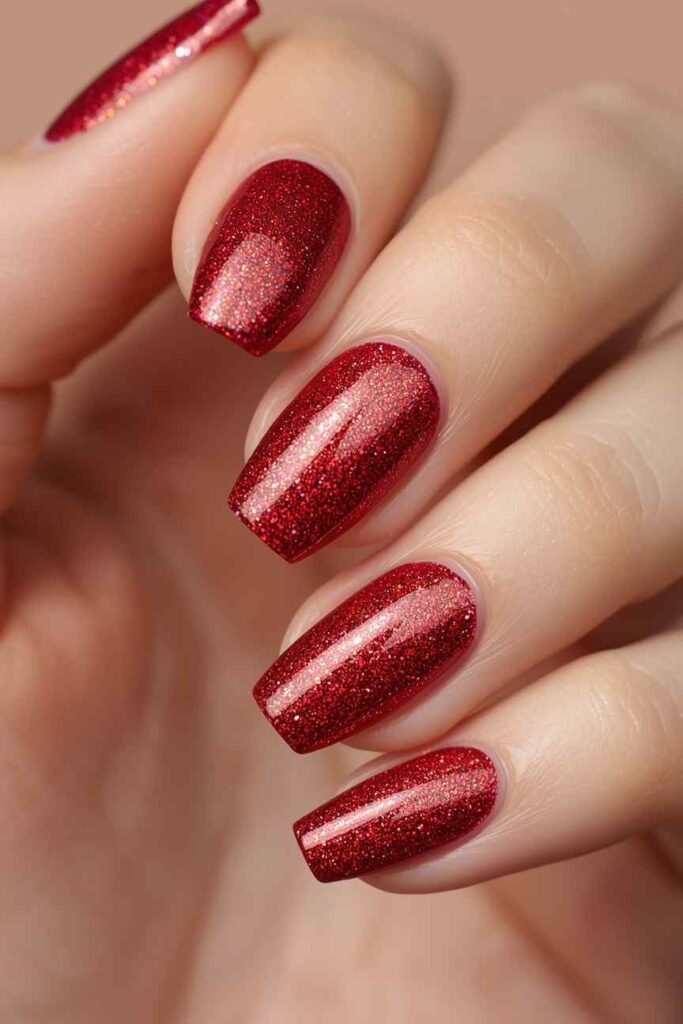 Red metallic glitter nails are the ultimate festive manicure for anyone who loves bold sparkle and holiday glamour. This design uses reflective glitter particles that shimmer under every light, making your nails the center of attention at any holiday event. The glitter’s metallic finish adds extra depth and shine, giving your manicure a luxurious feel.