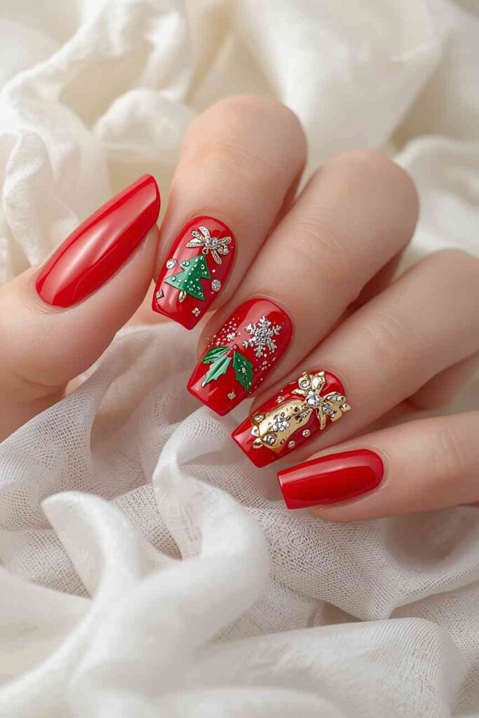 The bold red color ties everything together, giving the design a cohesive festive feel. Whether detailed or minimalist, this style captures the joyful spirit of Christmas, making it ideal for those who love playful, expressive holiday nail art.