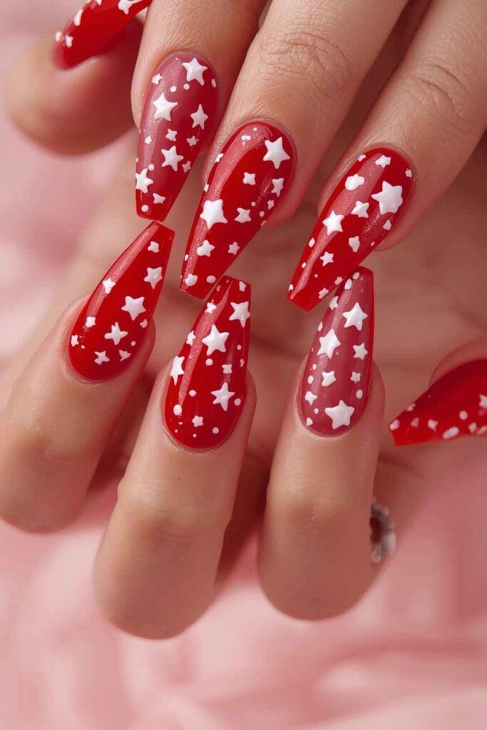 This design is perfect for December nights spent stargazing, wrapping gifts, or watching holiday movies. Depending on your preference, the stars can be scattered delicately or arranged in bold patterns. The contrast between the crisp white stars and the vibrant red makes the design pop beautifully.