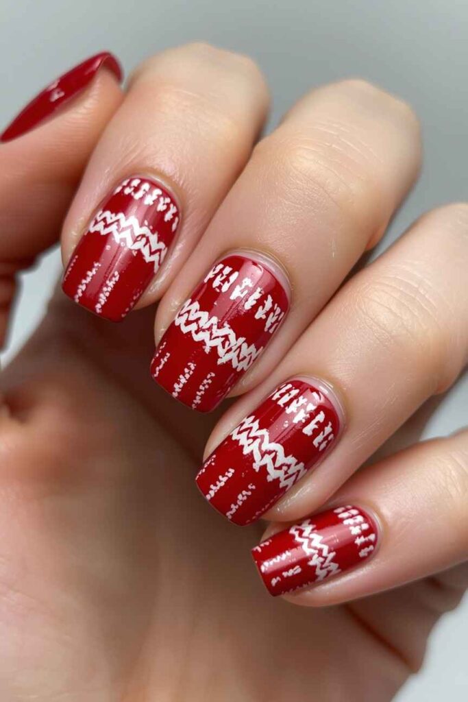 The combination of red and white is cheerful and classic, making the nails look festive without needing any extra sparkle. Whether you choose a full sweater pattern or accent nails, the overall effect feels like wearing winter comfort on your fingertips.
