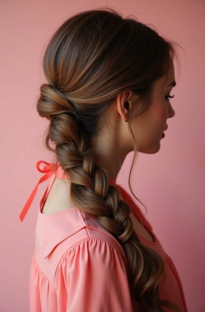 A loose side braid brings softness and charm to your Valentine’s Day look. This hairstyle feels relaxed and romantic, with a slightly undone finish that enhances its appeal. It’s ideal for long or medium hair and works beautifully with textured strands.
