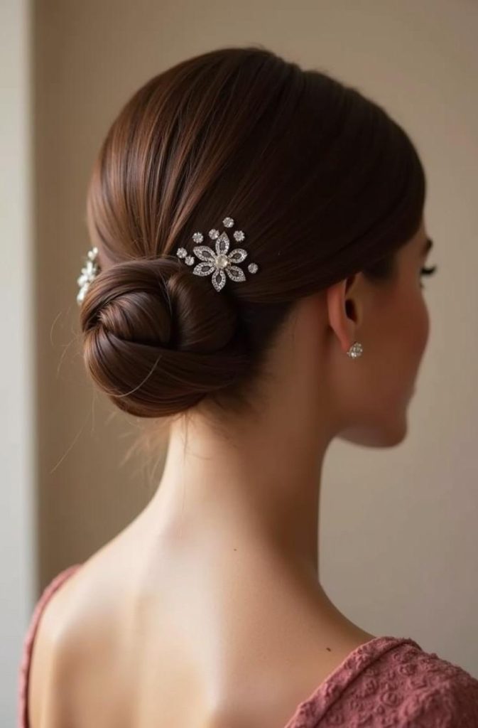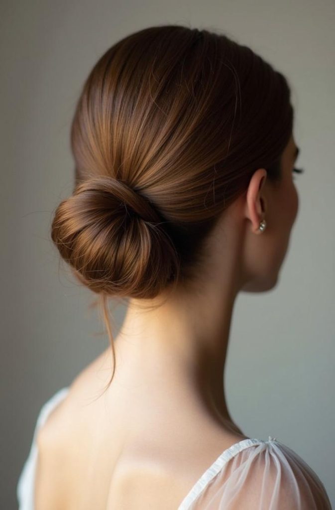 A low loose bun is understated, elegant, and incredibly romantic. This hairstyle sits softly at the nape of the neck, creating a graceful silhouette that feels effortless yet polished. It’s ideal for medium to long hair and works beautifully with face-framing strands for added softness.