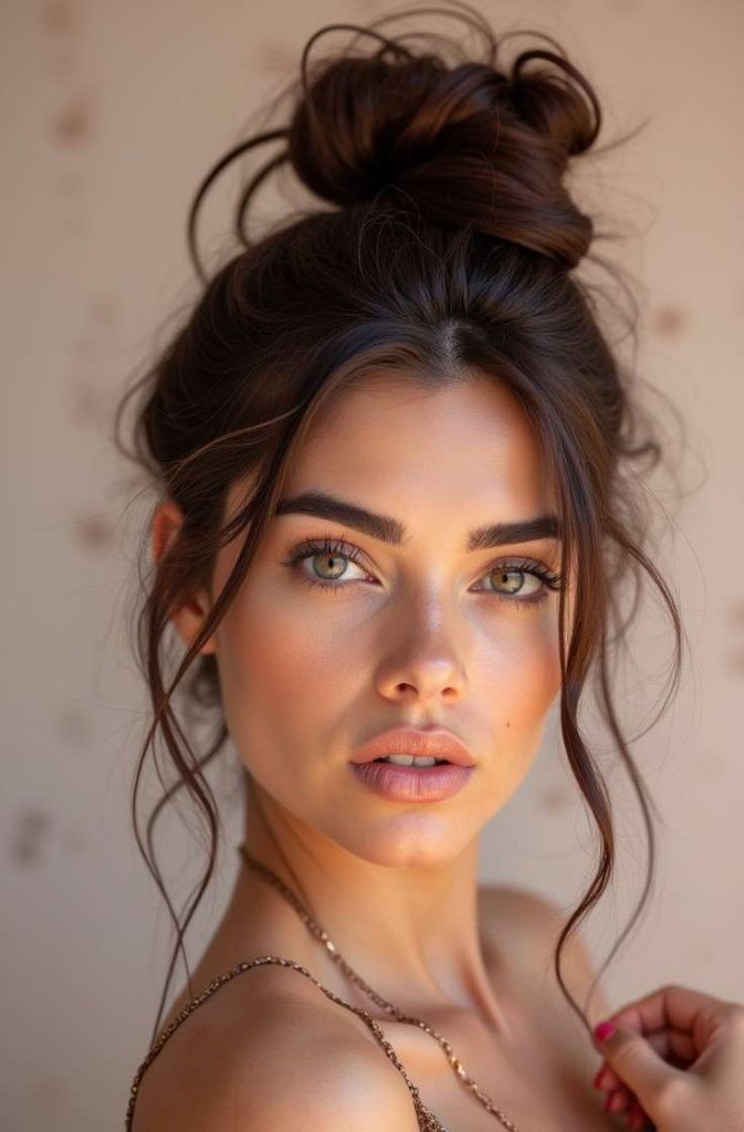 Face-framing strands soften the look and add a touch of femininity, making the hairstyle feel romantic rather than rushed. The messy top knot also highlights facial features and allows makeup and accessories to stand out.