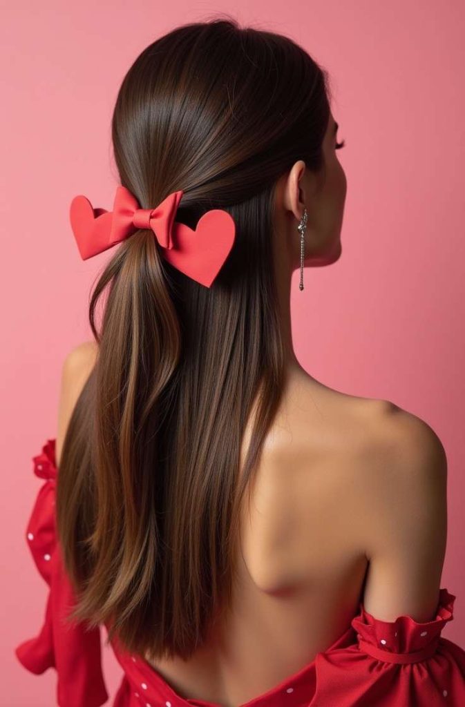 Straight hair with heart clips is a simple yet festive Valentine’s Day hairstyle that adds charm without requiring much effort. The sleek, smooth texture of straight hair provides a clean base, while heart-shaped accessories bring in a playful and romantic touch. This style is perfect for those who love minimal styling but still want to embrace the Valentine’s theme.