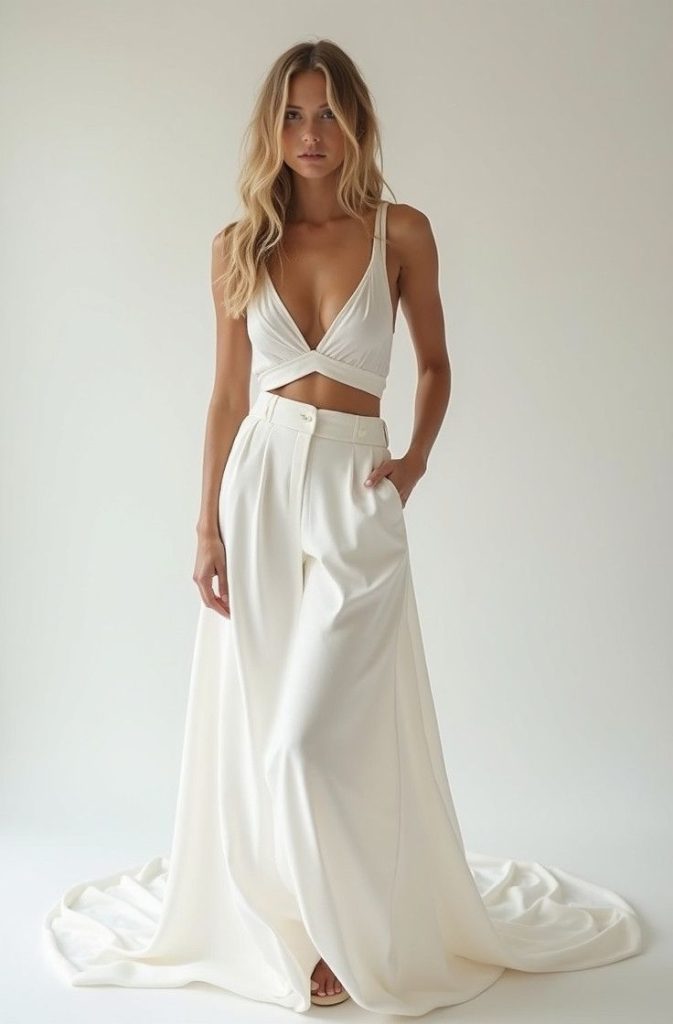 This look works well for daytime dates or minimalistic celebrations, offering versatility and sophistication. An all-white outfit allows you to play with silhouettes and accessories while maintaining a romantic, polished appearance.