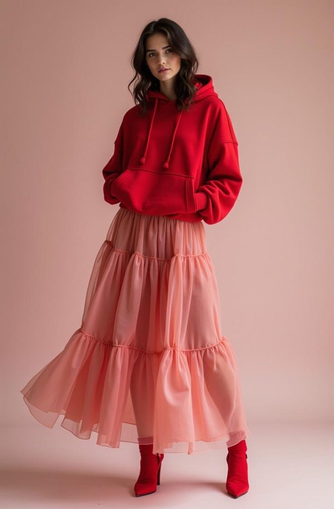 A hoodie paired with a romantic skirt creates a playful and trendy Valentine’s Day outfit that blends comfort with femininity. The casual hoodie adds warmth and ease, while the skirt introduces softness and elegance.