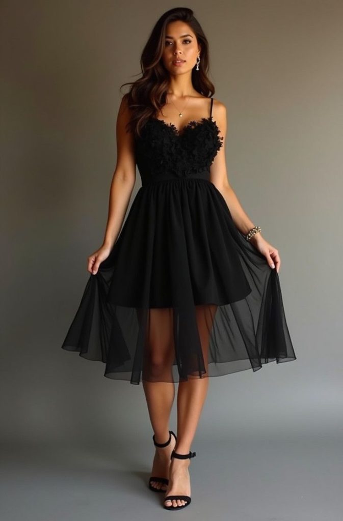 The dark base keeps the outfit timeless, while romantic details add charm and femininity. It’s an ideal balance of elegance and romance that never goes out of style.