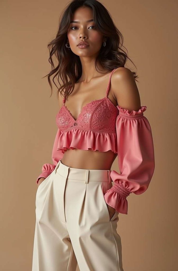 A statement top paired with neutral bottoms creates a stylish and balanced Valentine’s Day outfit. Bold details such as ruffles, lace, or unique textures draw attention, while neutral pants or skirts keep the look grounded.