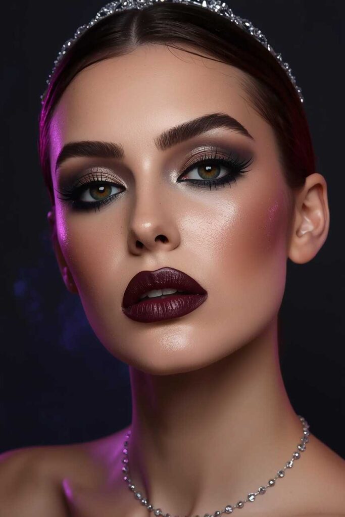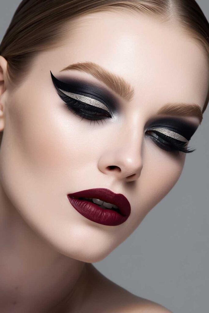 Dark feathered eyeshadow and metallic eyeliner evoke elegance and danger. Pair it with deep red or black lipstick for a bold finish.