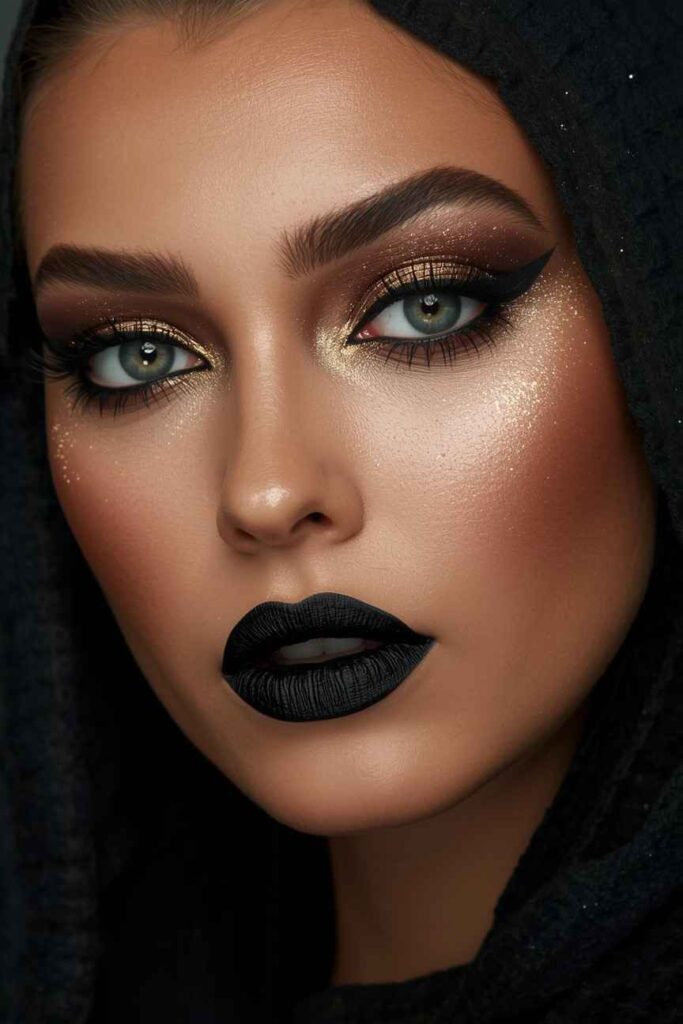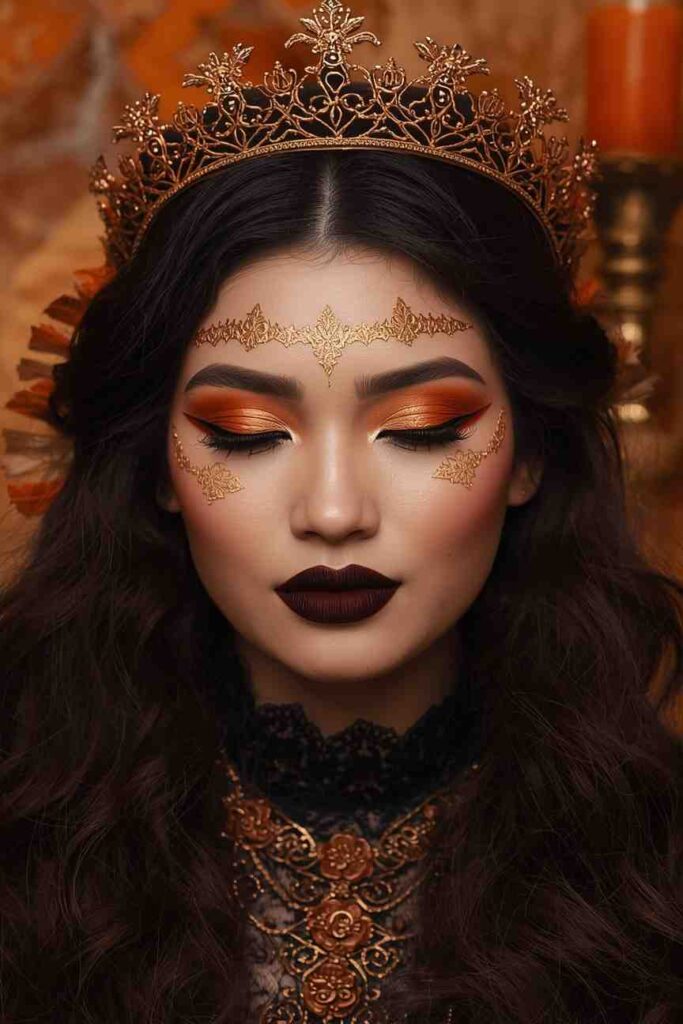 Use warm orange and gold eyeshadow tones paired with a dark lip. This look celebrates Halloween’s festive side while maintaining a chic vibe.