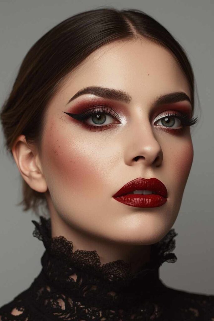 Combine dark red eye shadow, deep contour, and glossy crimson lips. Smudge eyeliner slightly for a sultry yet sinister effect. It’s perfect for a royal vampire vibe.