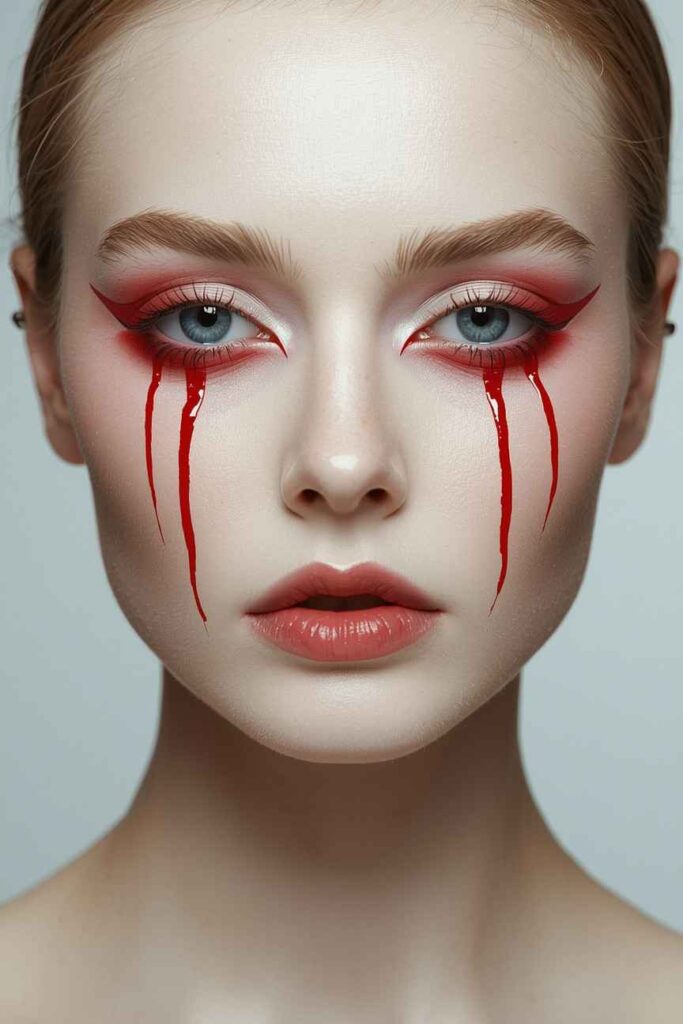 A hauntingly beautiful design—create red “tears” under your eyes using fake blood or red liner. Keep the rest of the face pale and soft for contrast.