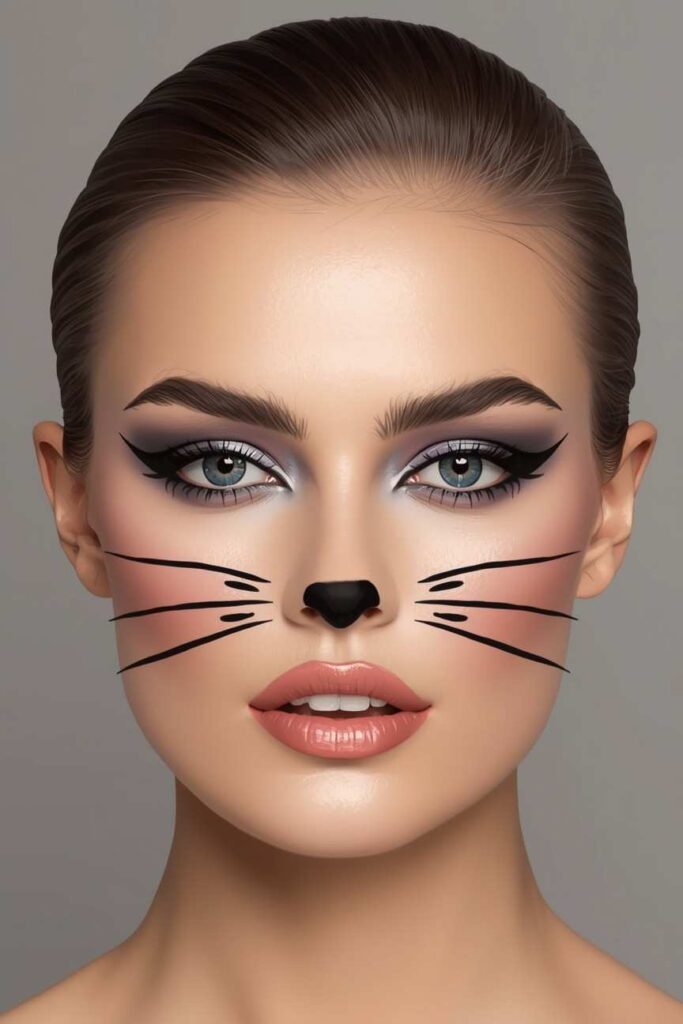 A timeless choice—winged eyeliner, sharp contour, and nude lips. Add whiskers and a cat nose for a sleek, sultry feline finish.