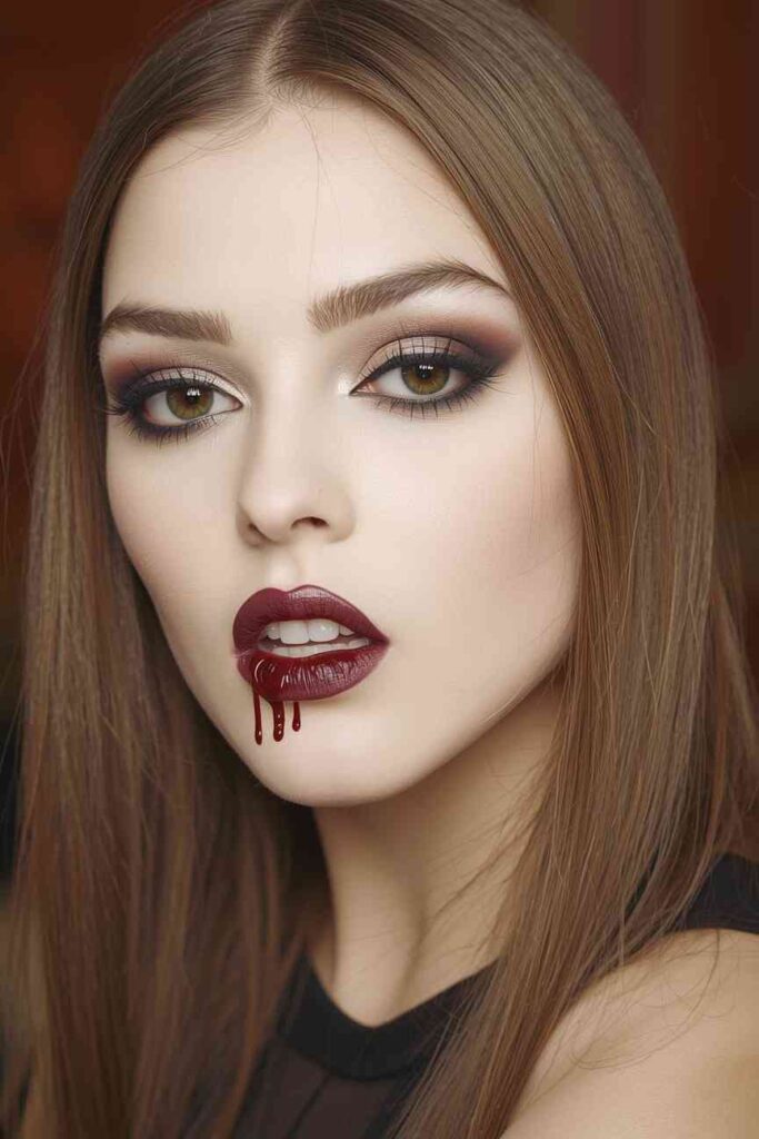 Create a pale, flawless base with deep contouring for a hollowed effect. Add dark plum or red lipstick and smoky eyes to enhance the vampire allure. Don’t forget subtle fake blood near the lips for drama.