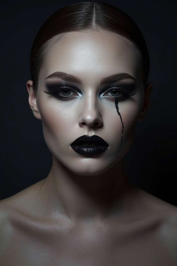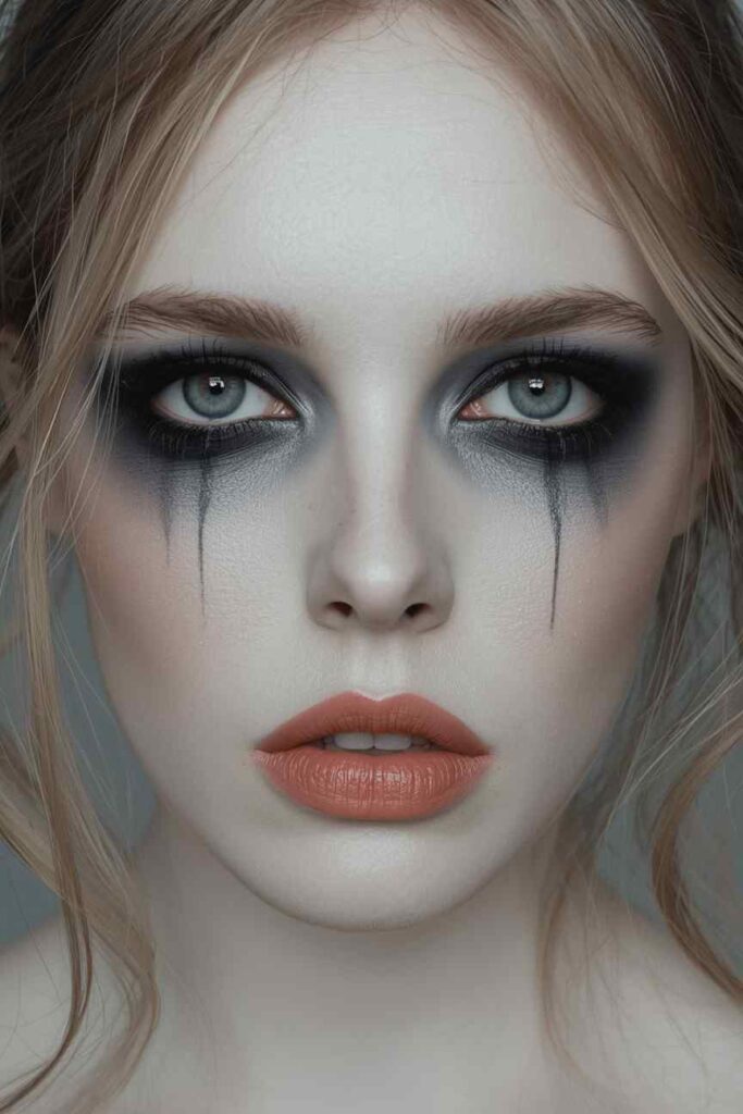 Use a pale base, dark under-eye shadow, and subtle blue-gray tones on the cheeks. Finish with smudged mascara tears and a soft rose lip for tragic romance.
