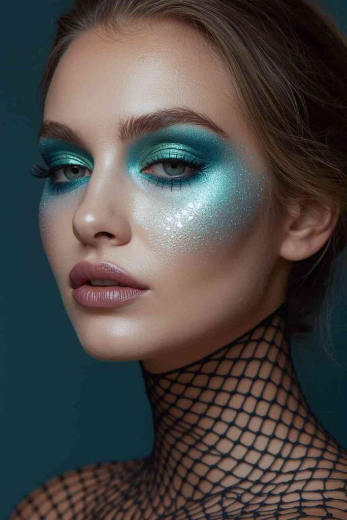 Combine teal, turquoise, and deep navy hues on the eyes and cheeks. Add shimmer scales using fishnet stockings as a stencil for a mysterious undersea vibe.