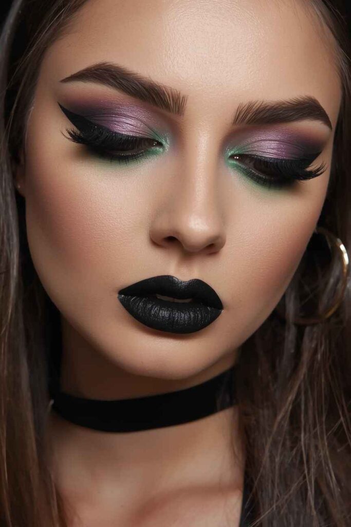 Smoky greens, purples, and blacks bring the witchy vibe alive. Add a touch of shimmer on the eyelids, a bold eyeliner wing, and dark lips for a powerful and mysterious finish.