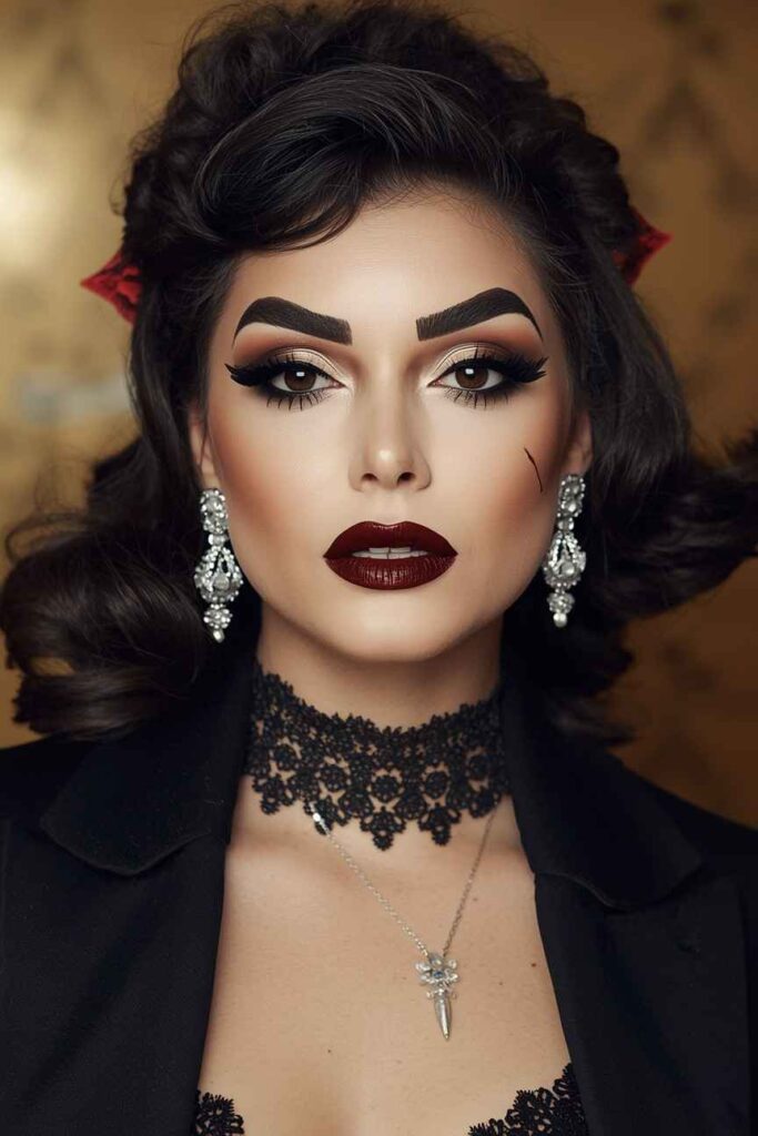 Mix classic Hollywood glam with dark tones—think winged liner, shimmering champagne eyeshadow, and dark berry lips. A subtle blood mark completes the transformation.
