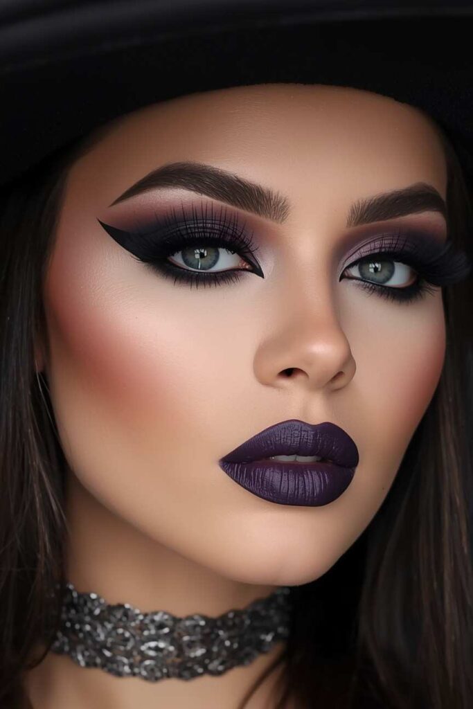 Matte black eyeshadow, dark purple lipstick, and sharp contouring make this witch look bold and mesmerizing. Add false lashes for extra drama.