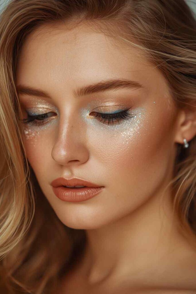 Blend silver and blue tones on the eyes and temples. Add highlighter on cheekbones and glitter freckles for a celestial, radiant finish.
