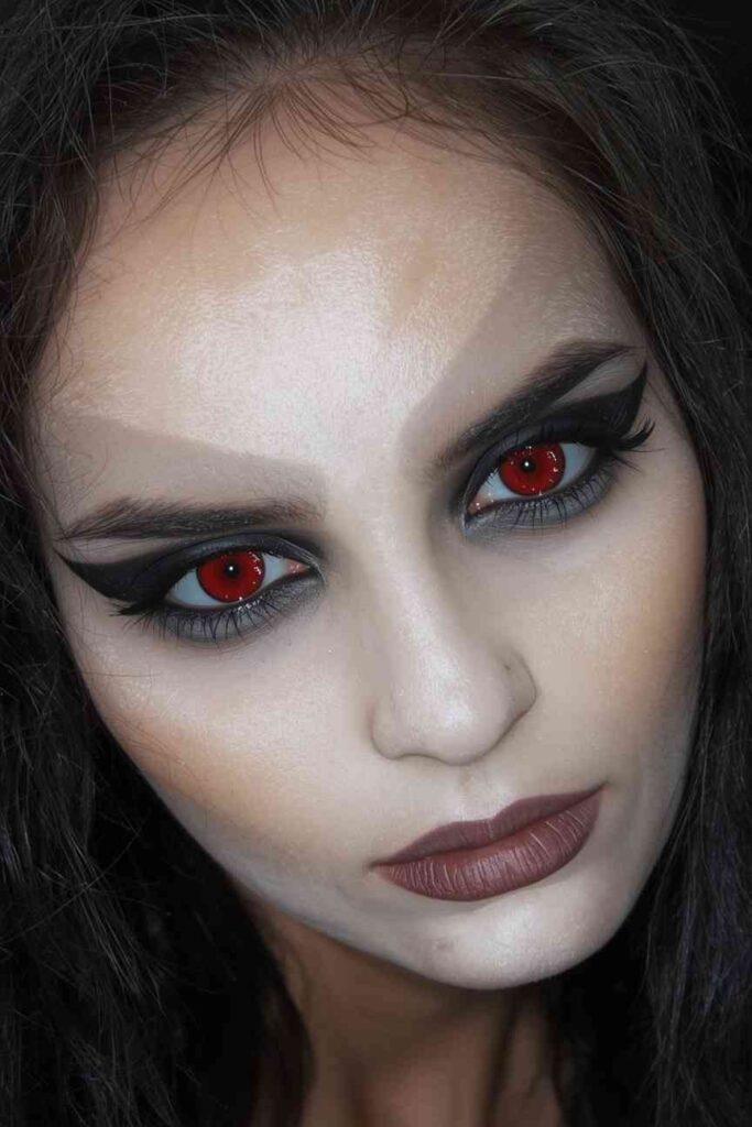 Use red or white contact lenses, heavy black liner, and pale foundation for a possessed aesthetic. Smudge gray shadow around the eyes to deepen the eerie effect.