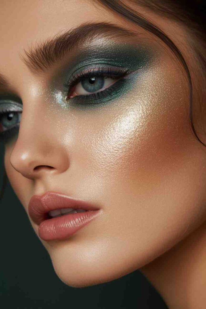 Dark iridescent eyeshadow shades like green, violet, and navy define this look. Add shimmering highlights and delicate glitter to give an enchanting woodland spirit touch.