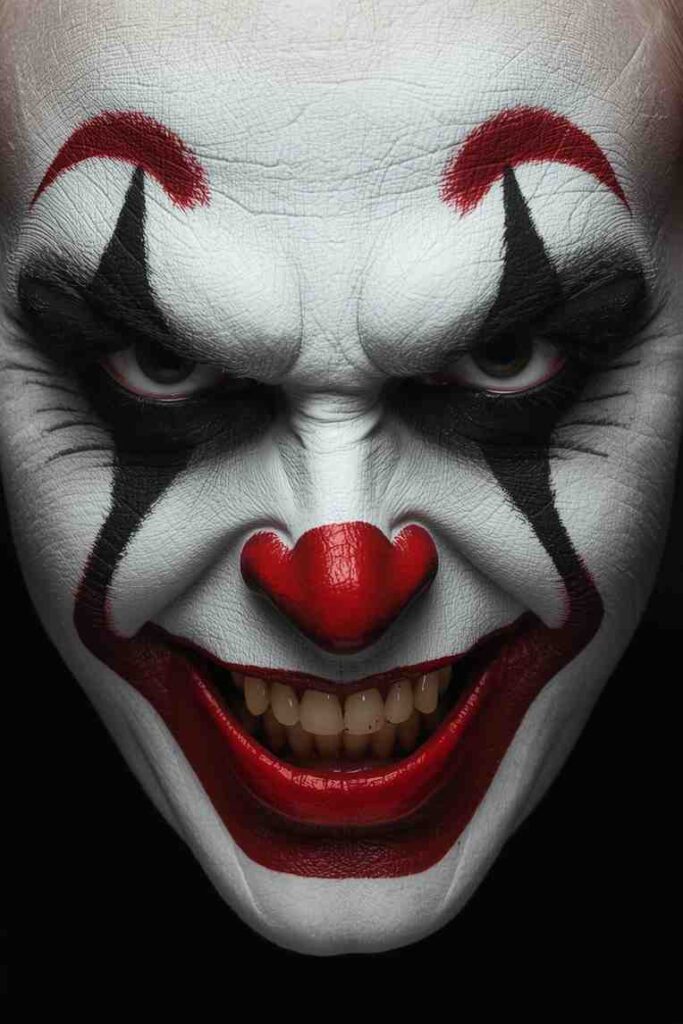 Smudge black liner and red lipstick dramatically for a twisted clown look. Add tears or heart shapes for a sinister, theatrical finish.