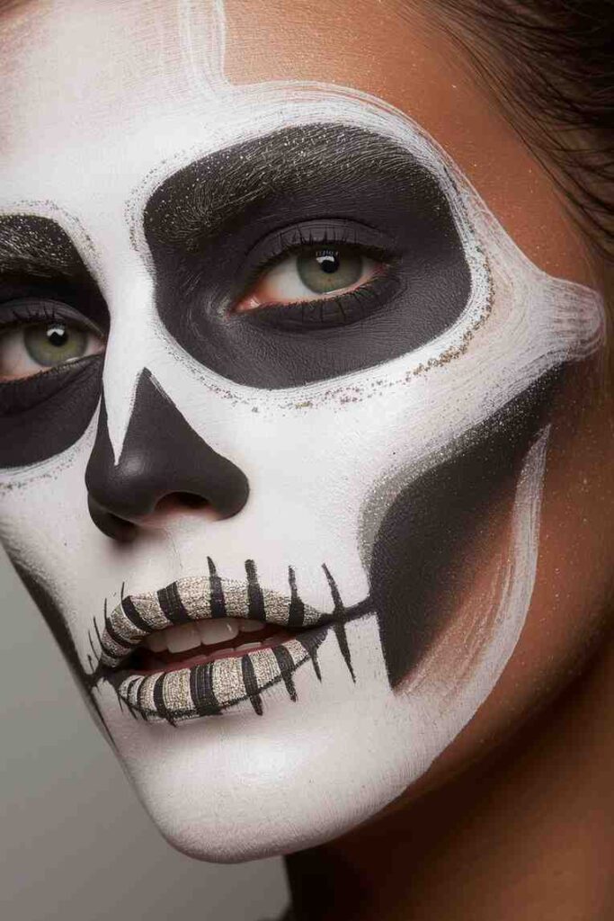 Use white face paint to outline your skull and black shadow for hollow areas. Add glitter to soften the effect for a chic skeletal style.