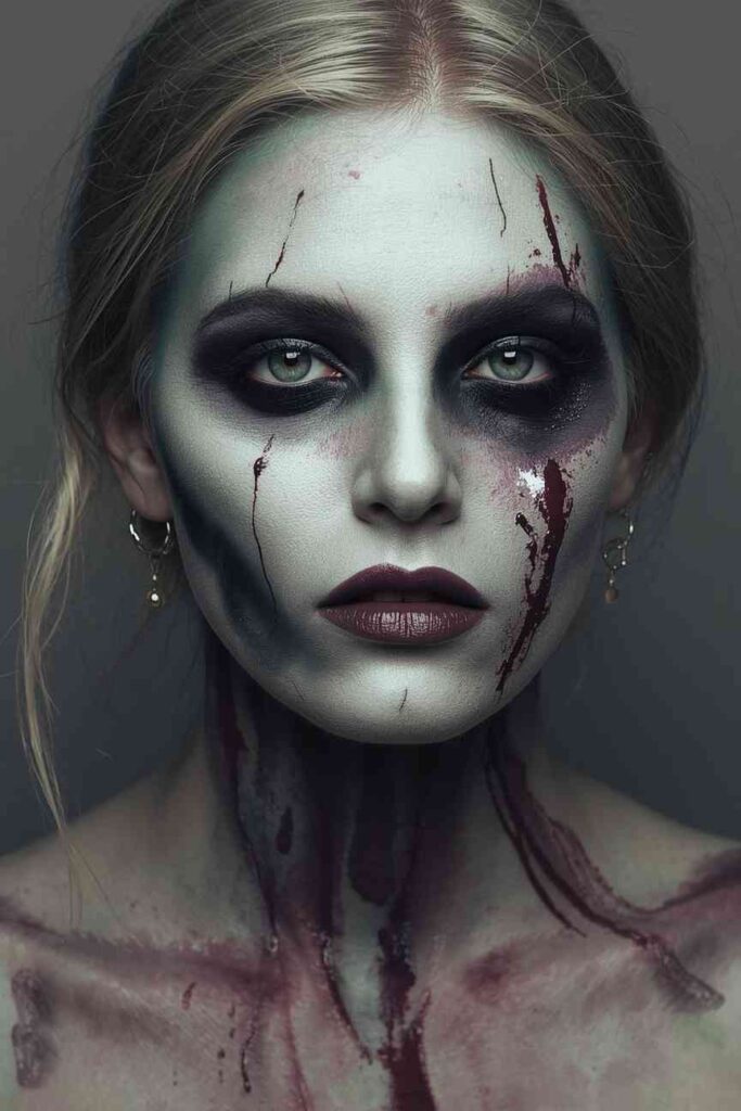 Blend grays, greens, and bruised purples across your face and neck. Create shadowy hollows under the eyes for depth, and add fake wounds or veins for a realistic undead effect.