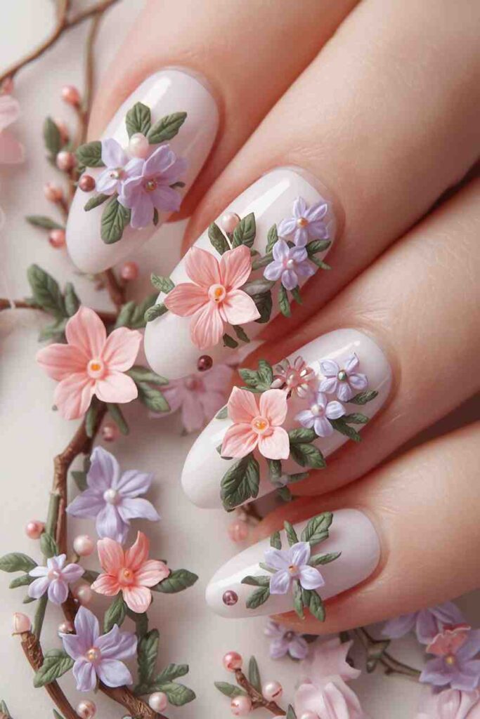 Adding 3D floral elements gives a delicate yet dramatic effect. Small blossoms in metallic tones or autumnal colors bring texture and depth to your nails. Perfect for special occasions, these designs combine femininity with statement-making artistry.