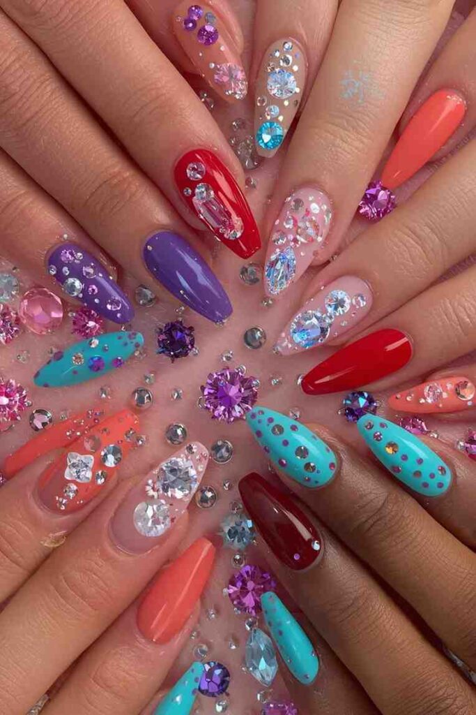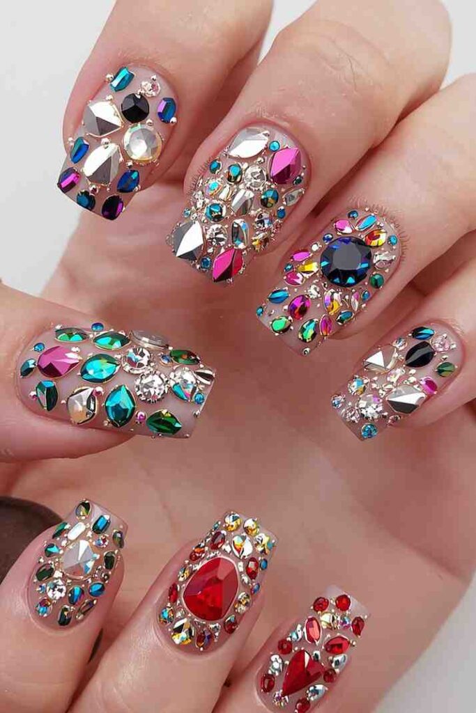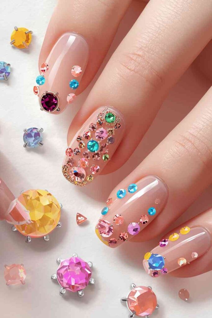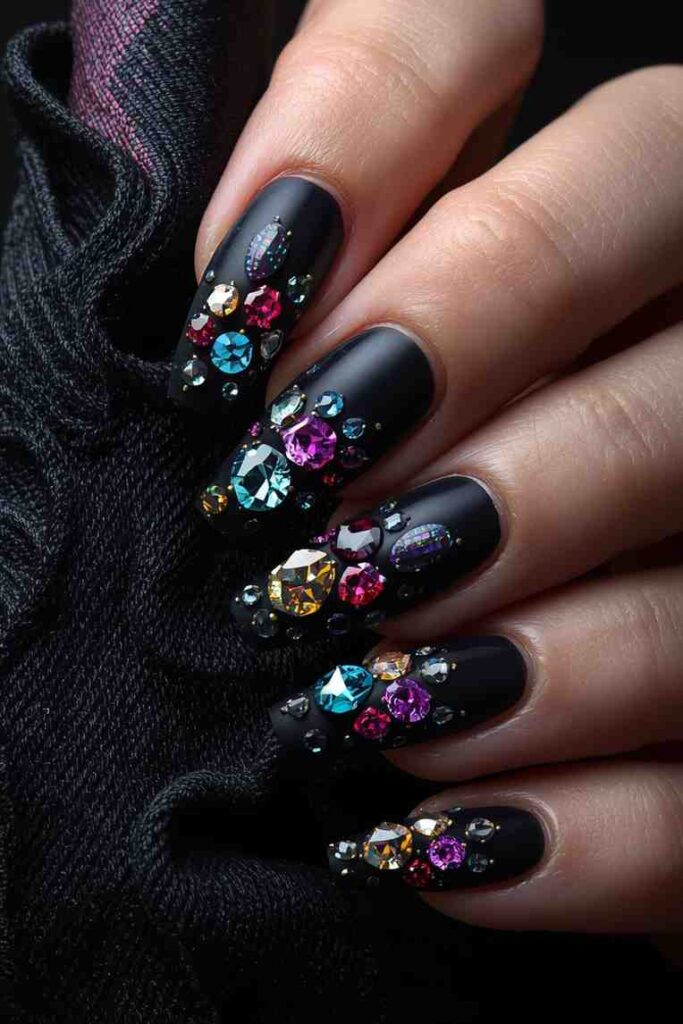 Place gems on deep burgundy or navy nails for a dramatic effect. The contrast between dark shades and sparkling stones elevates your manicure instantly. Perfect for evening events or autumn weddings, this style is both bold and sophisticated.