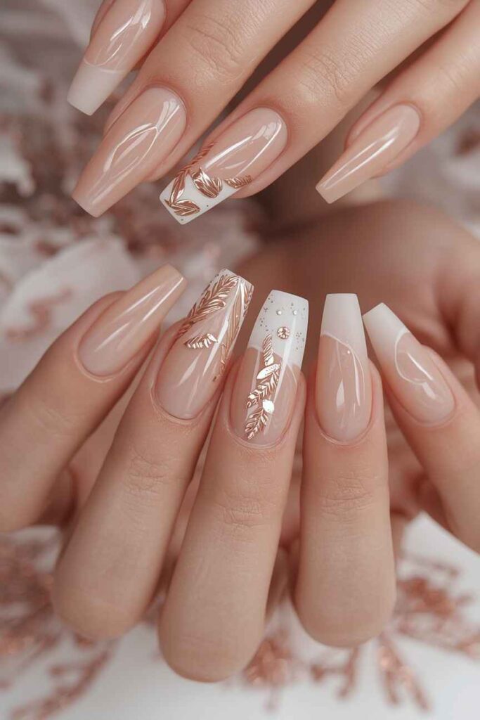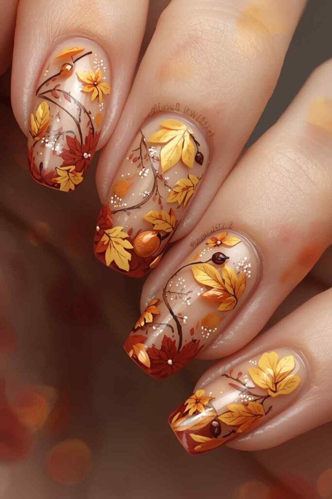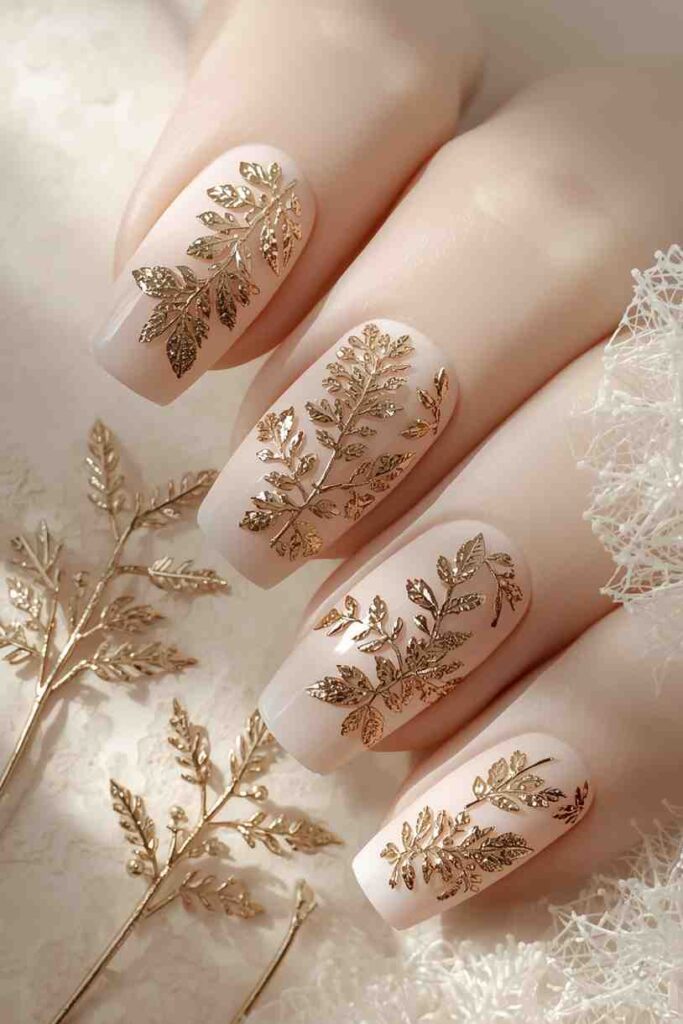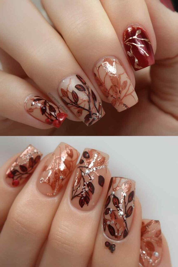 Copper leaf accents add warmth and richness. Apply over deep brown or burgundy nails for a luxurious fall effect. The metallic sheen combined with natural autumn tones makes this design elegant and eye-catching.