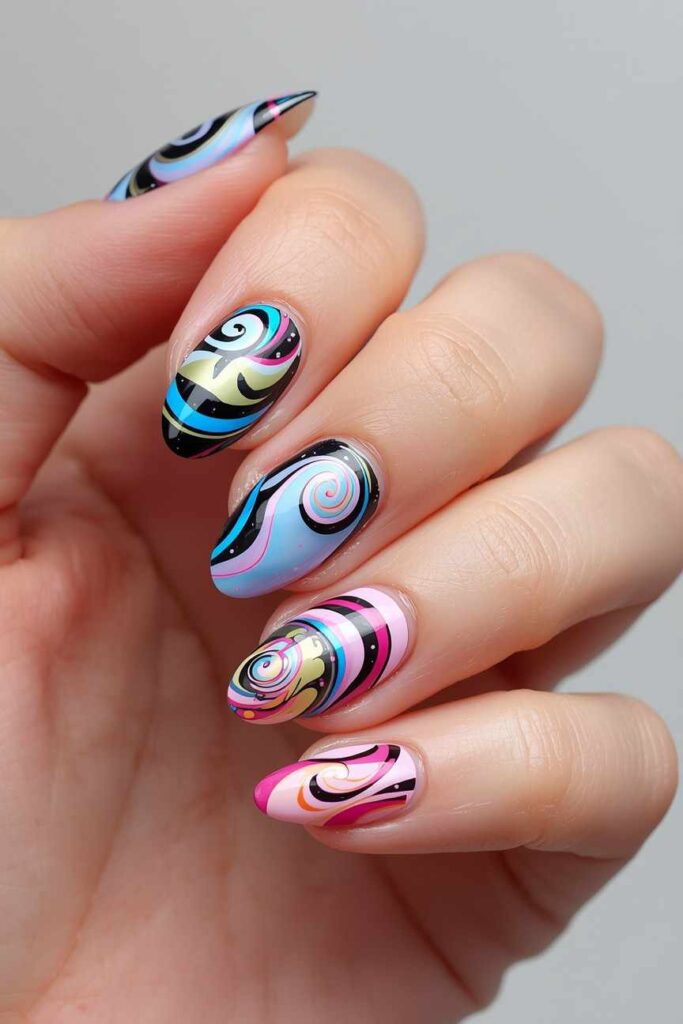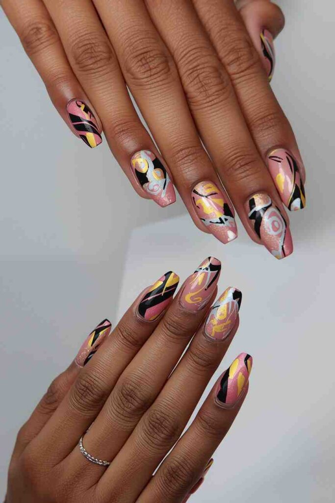 Abstract metallic designs allow creativity to shine. Swirls, lines, and shapes in mixed metals create a bold, artistic manicure. Ideal for fashion-forward individuals, this trend merges modern art with autumn style effortlessly.