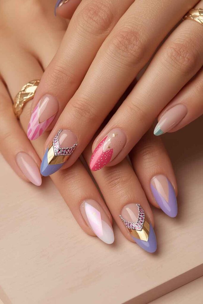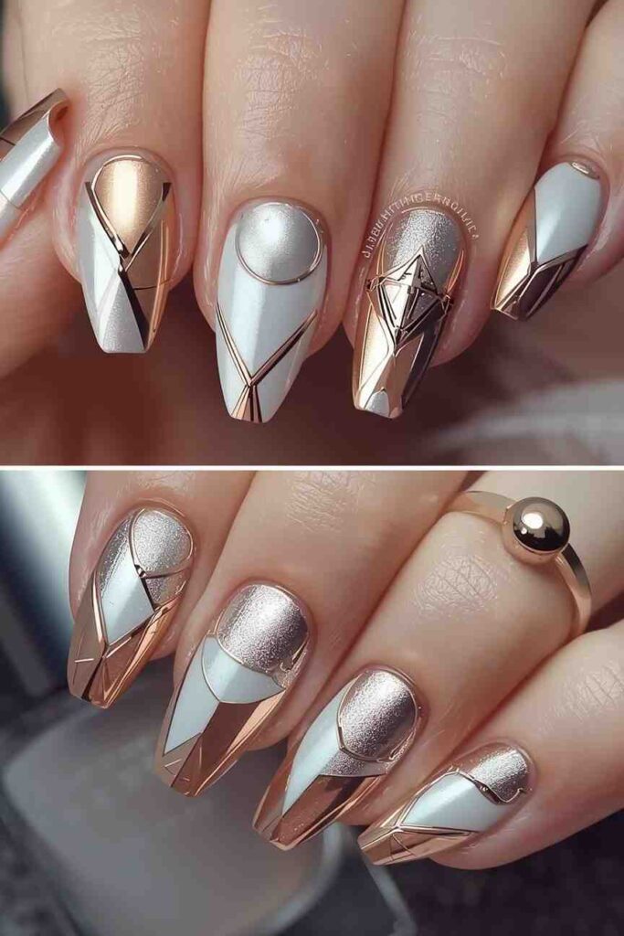 Geometric metallic designs provide a modern, artistic touch. Triangles, squares, and lines in gold or silver add structure and sophistication. These patterns are ideal for those who love clean, contemporary, and statement-making nails.
