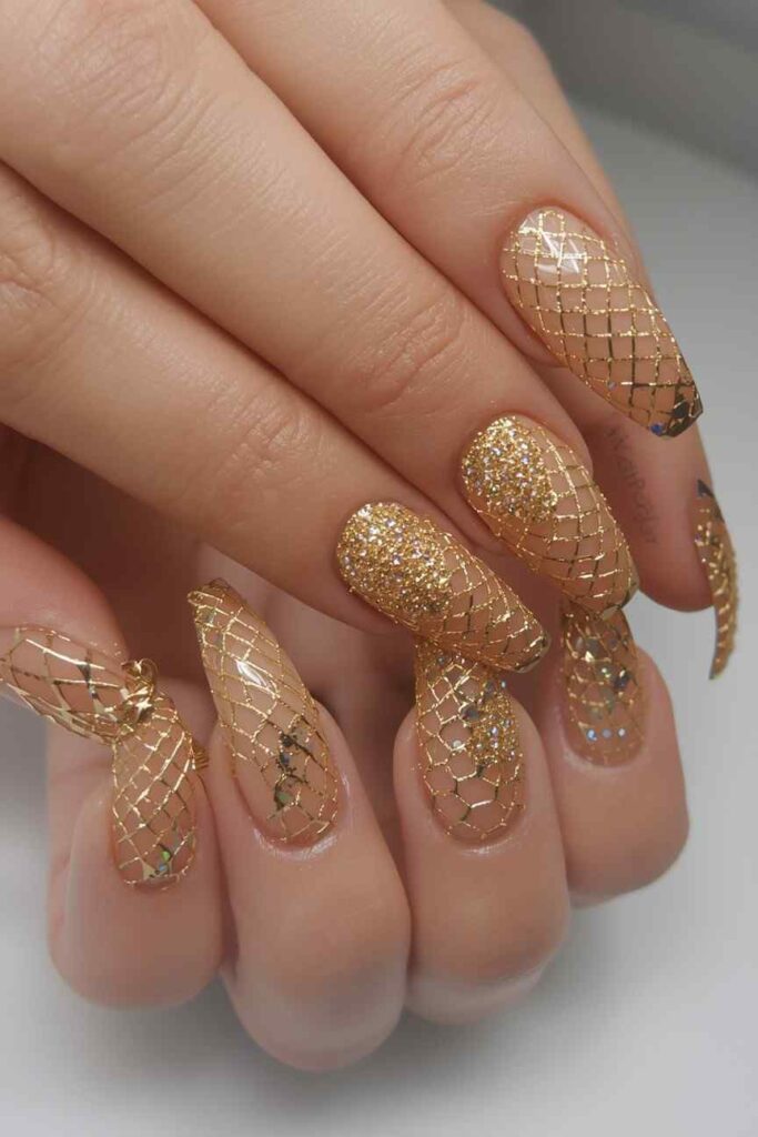 Gold mesh patterns create intricate, textured designs. Use as accent nails or across the entire hand for maximum impact. This edgy yet elegant trend adds depth, shimmer, and a modern flair to your fall nails.